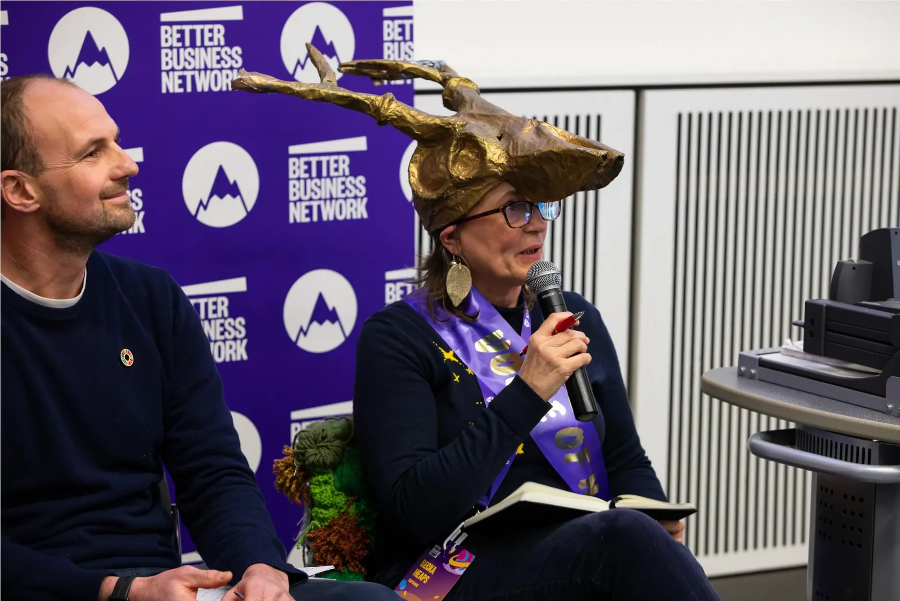 Just last month, I attended the Better Business Summit which kicked off with the announcement that the Better Business Network had also made Nature a director. To give immediate voice to their move, Nature was given a seat on every panel — and so Nature on the Board was present not just in my talk, but in every talk over the two days. To accomplish this, Nature had nine different guardians with each bringing their own perspectives and theatrics to the idea. (Yes, this is serious… but it can also be fun, right?) Here’s a panel with Nature represented by Rebecca Heaps, wearing a stag’s head as loaned to her for the occasion by Nick Hayes, author of The Book of Trespass. Is this a vision of all panels to come…?!
